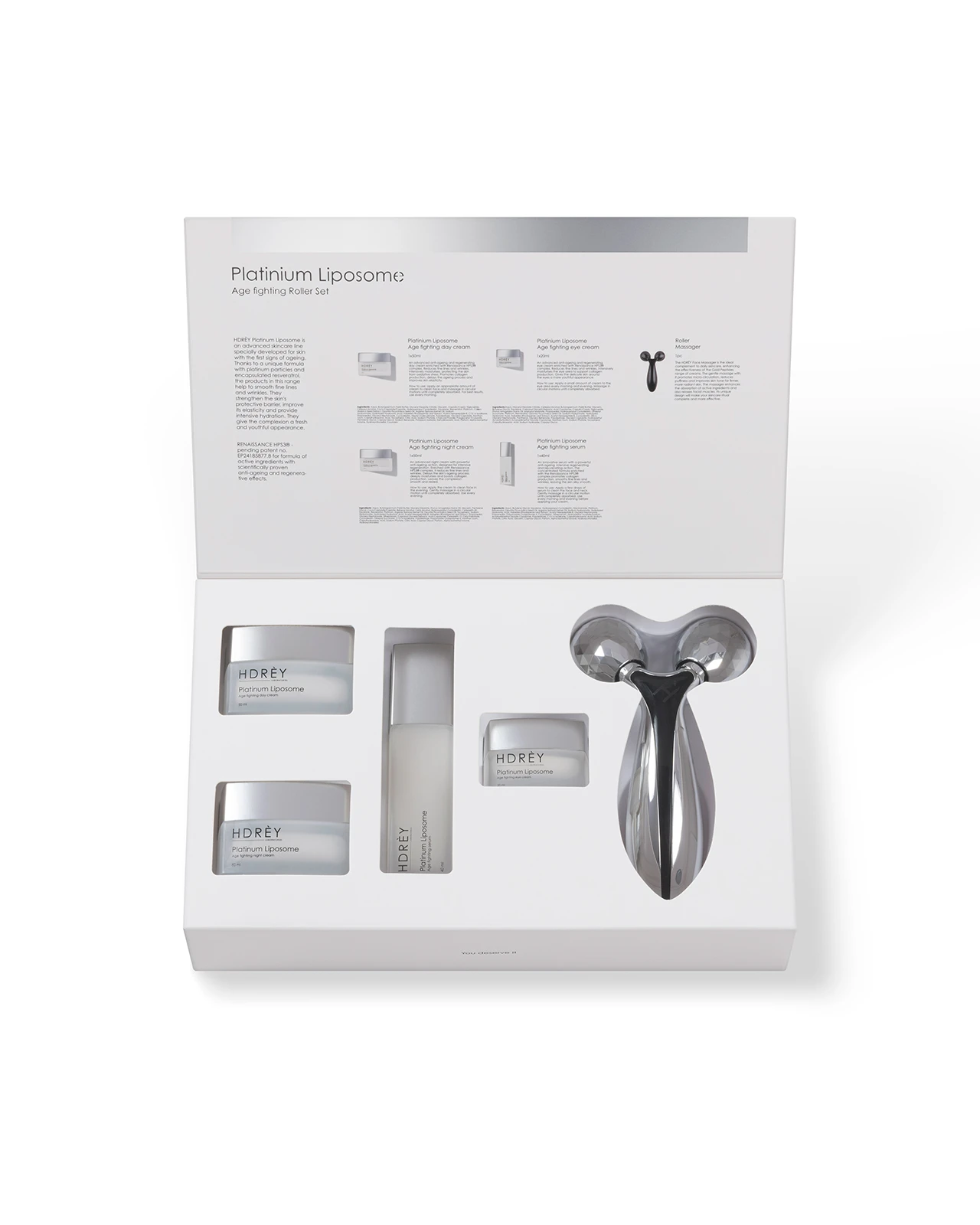 Platinum Liposome Age fighting serum 40 ml: Aqua, Butylene Glycol, Squalane, Hydroxypropyl Cyclodextrin, Niacinamide, Platinum, Resveratrol, Opuntia Ficus-Indica Seed Oil, Sodium Hyaluronate, Hydrolyzed Hyaluronic Acid, Haberlea Rhodopensis Leaf Extract, Acetyl Hexapeptide-8, Glyceryl Heptanoate, Propanediol, Polyacrylate Crosspolymer-6, Cyclodextrin, Triheptanoin, Hydroxyethyl Acrylate/Sodium Acryloyldimethyl Taurate Copolymer, Polydextrose, C13-16 Isoalkane, Caprylhydroxamic Acid, Sodium Phytate, Citric Acid, Glycerin, Caprylyl Glycol, Parfum, Alpha-Isomethyl Ionone, Hydroxycitronellal