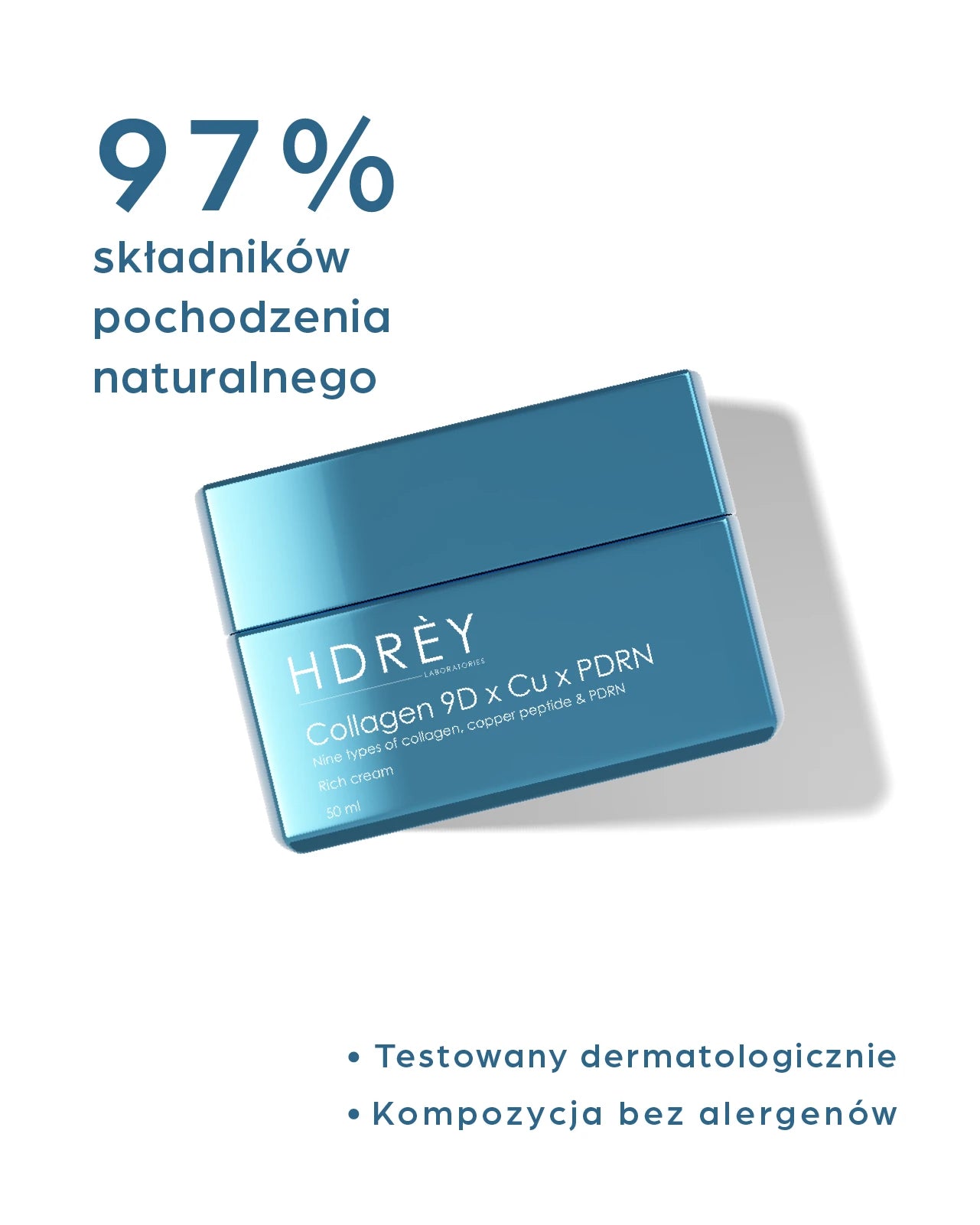 Formuła kremu została wzbogacona o kompleks kolagenowy 9D, który działa wielopoziomowo – odbudowuje włókna podporowe skóry, zwiększa jej gęstość i elastyczność oraz poprawia napięcie. Zawarty w kremie peptyd miedziowy stymuluje naturalną produkcję kolagenu i elastyny, przyspiesza procesy naprawcze oraz działa antyoksydacyjnie. Z kolei PDRN wspomaga regenerację komórkową, poprawia mikrokrążenie i wzmacnia strukturę skóry, nadając jej młodzieńczy wygląd. Całość uzupełnia kompleks Renaissance HPS3®, który zapewnia dodatkową ochronę i odbudowę bariery hydrolipidowej.