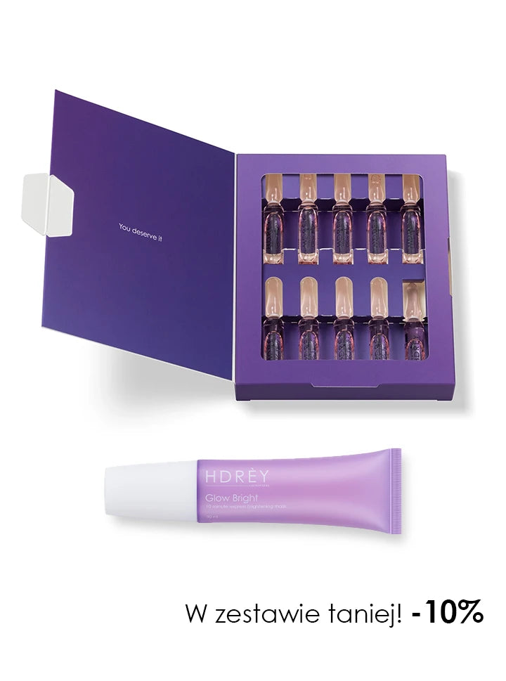 Zestaw Glow Bright to starannie opracowane połączenie dwóch synergicznie działających produktów, stworzonych z myślą o skórze potrzebującej intensywnego nawilżenia, regeneracji i rozświetlenia. Komplementarne działanie maski i ampułki zapewnia kompleksową pielęgnację, która widocznie poprawia kondycję cery, przywracając jej naturalny blask, jednolity koloryt i zdrowy wygląd.