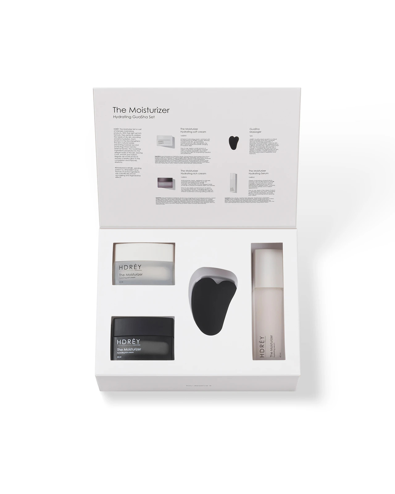 HDRÈY The Moisturizer Hydrating GuaSha Set to zestaw pielęgnacyjny stworzony dla skóry wymagającej intensywnego nawilżenia. Formuły wzbogacone o kompleks Renaissance HPS® głęboko nawadniają, odbudowują barierę hydrolipidową i przywracają skórze komfort. Produkty z zestawu zapewniają długotrwałe nawilżenie, regenerację oraz gładkość cery. Kamień GuaSha wspomaga mikrokrążenie, ujędrnia skórę i poprawia wchłanianie składników aktywnych.