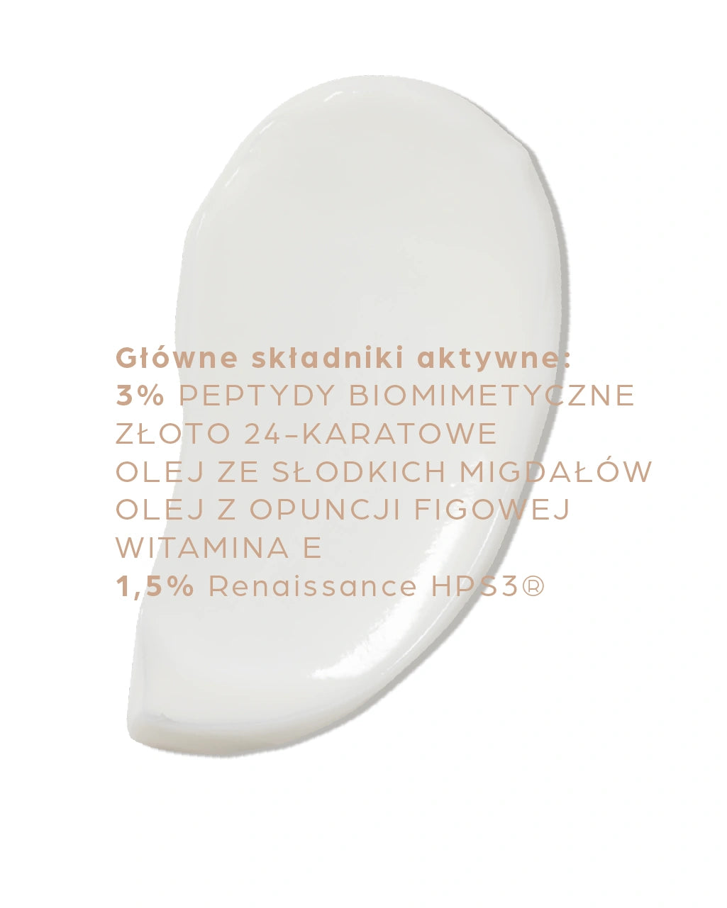 Formuła kremu pod oczy zawiera kompleks peptydowy, który stymuluje syntezę kolagenu i elastyny, pomagając chronić przed pierwszymi oznakami starzenia. Dodatek złota wspomaga mikrocyrkulację, co zmniejsza widoczność cieni pod oczami, jednocześnie działając przeciwzapalnie. Złoto wzmacnia strukturę skóry, czyniąc ją bardziej jędrną i sprężystą.