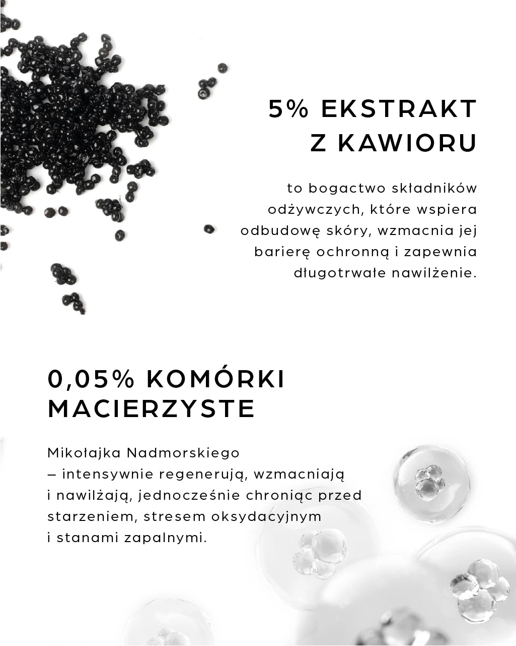 Ekstrakt z kawioru to ekskluzywny składnik aktywny, który intensywnie odżywia i regeneruje skórę, dostarczając jej cennych białek, aminokwasów, nienasyconych kwasów tłuszczowych oraz witamin A, D, E i z grupy B. Dzięki temu wspomaga naturalne procesy odbudowy naskórka, wzmacnia barierę ochronną skóry i utrzymuje odpowiedni poziom nawilżenia. Zawarte w ekstrakcie antyoksydanty chronią skórę przed wolnymi rodnikami, spowalniając procesy starzenia, a także stymulują produkcję kolagenu i elastyny, co wpływa na poprawę jędrności, elastyczności i gładkości skóry.
