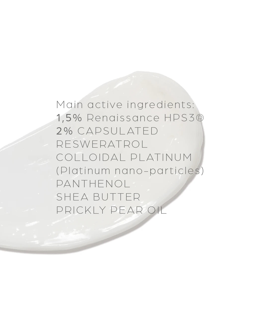 Propanediol, Hydroxypropyl Cyclodextrin, Diheptyl Succinate, Platinum, Resveratrol, Opuntia Ficus-Indica Seed Oil, Sodium Hyaluronate, Hydrolysed Hyaluronic Acid, Haberlea Rhodopensis Leaf Extract, Acetyl Hexapeptide-8, Cyclodextrin, Silica, Glyceryl Heptanoate, Panthenol, Glyceryl Behenate,