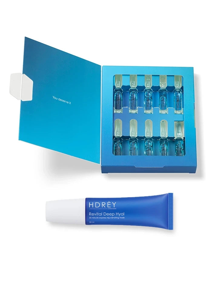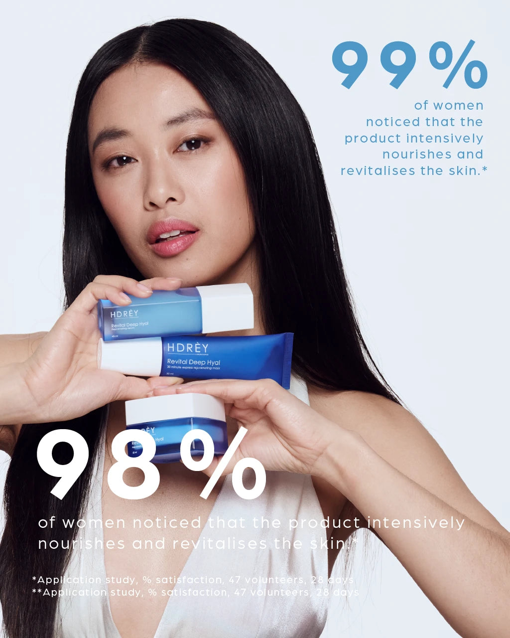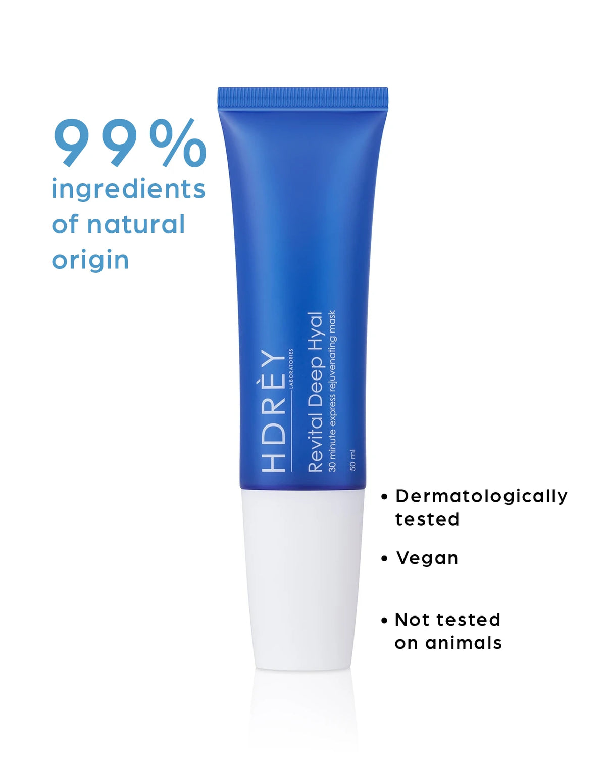 Apply an appropriate amount of the mask using the integrated applicator to cleansed skin on the face and neck. Leave for 30 minutes, then rinse with water. For best results, use twice a week, complementing your care with other HDRÈY Revital Deep Hyal products.