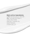 Aqua, Glyceryl Stearate Citrate, Cetearyl Alcohol, Glycerin, Butyrospermum Parkii Butter, Butylene Glycol, Squalane, Capryloyl Glycerin/Sebacic Acid Copolymer, Isopropyl Myristate, Prunus Amygdalus Dulcis Oil, Caprylic/Capric Triglyceride, Propanediol, Diheptyl Succinate, Opuntia Ficus-Indica Seed Oil, Caviar Extract, Eryngium Maritimum Callus Culture Filtrate, Haberlea Rhodopensis Leaf Extract, Sodium Hyaluronate, Hydrolyzed Hyaluronic Acid, Acetyl Hexapeptide-8, Silica, Glyceryl Heptanoate, Panthenol, Glyceryl Behenate, Glyceryl Caprylate, Hydroxyethyl Acrylate/Sodium Acryloyldimethyl Taurate Copolymer, Xanthan Gum, Sodium Phytate, Caprylhydroxamic Acid, Tocopherol, Caprylyl Glycol, Sodium Hydroxide, Citric Acid, Sodium Benzoate, Potassium Sorbate