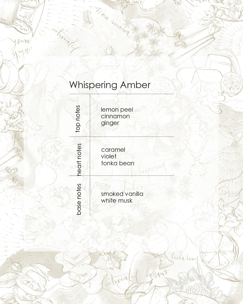 Whispering Amber Liquid hand soap 300 ml: Aqua, Sodium Coco-Sulfate, Glycerin, Cocamidopropyl Betaine, Parfum, Pongamia Pinnata Seed Extract, Kaempferia Galanga Root Extract, Sodium Chloride, Sodium Benzoate, Potassium Sorbate, Polyquaternium-10, Isoamyl Laurate, Triethyl Citrate, Citric Acid, Sodium Phytate, Curcuma Longa Root Extract, Maltodextrin, Acacia Senegal Gum, Eugenol, Linalool, Benzyl Alcohol, Limonene.