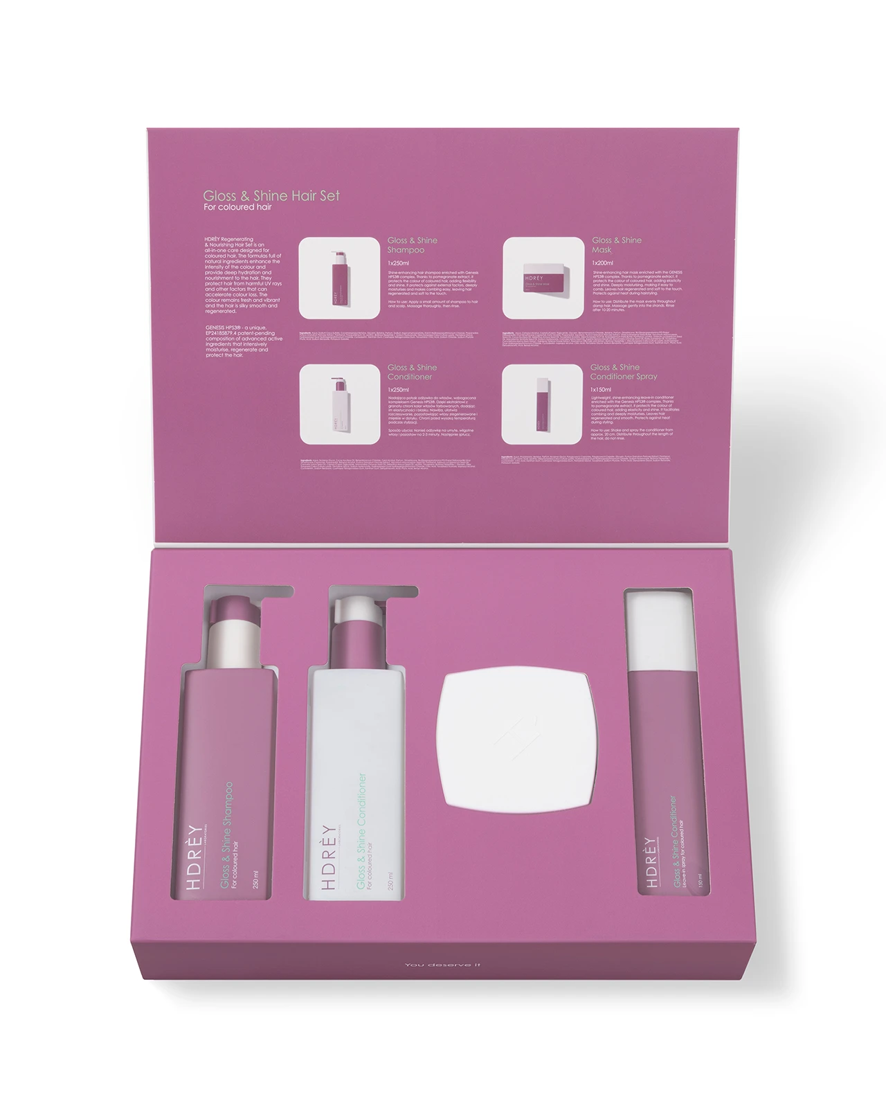 All products in the set are enriched with Genesis HPS3® complex, which intensively strengthens the hair structure, protects against damage and provides long-lasting hydration. It keeps hair healthy, flexible and resistant to external factors.