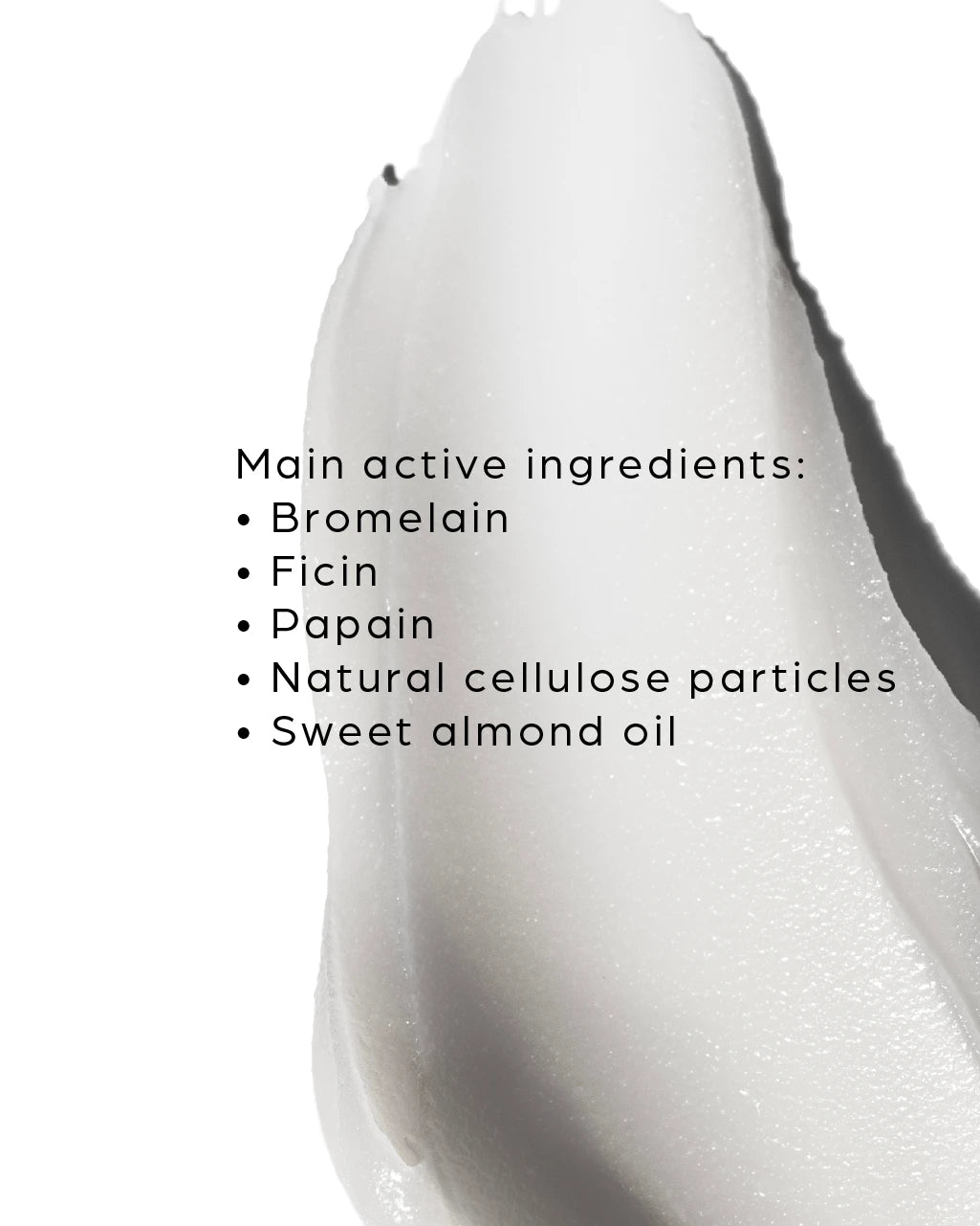 qua, Cellulose, Cetearyl Alcohol, Butylene Glycol, Cocos Nucifera Oil, Cocamidopropyl Betaine, Prunus Amygdalus Dulcis Oil, Cetyl Alcohol, Sodium Citrate, PEG-100 Stearate, Glyceryl Stearate, Propanediol, Ficin, Bromelain, Papain, Gluconolactone, Glucose, Polyacrylate Crosspolymer-6, Tocopheryl Acetate, Citric Acid, Sodium Chloride, Sodium Benzoate, Acacia Senegal Gum, Xanthan Gum, Glycerin, Calcium Gluconate, Parfum, Benzyl Salicylate